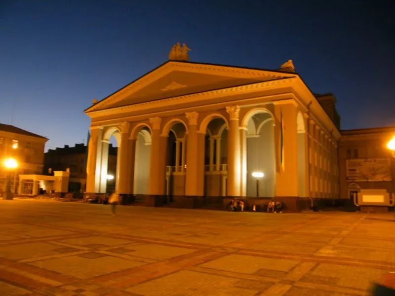 З правого боку від драмтеатру стоїть готель «Україна».