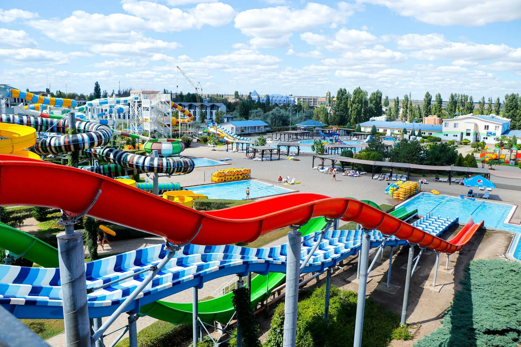 Інфраструктура аквапарку складається з трьох видів басейнів: дитячого, басейну з гідромасажем та плавального басейну. Проте основними атракціями є безсумнівно 9 гірок, кожна з яких має свою власну назву та неперевершений драйв. Захоплення включає "Камікадзе", "Літаючий човен", "Серпантин" та безліч інших оригінальних атракціонів. Для маленьких відвідувачів тут також є 10 дитячих гірок, де діти можуть весело проводити час.